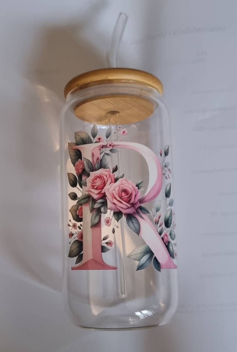 Borosilikatglas mit Trinkhalm und Holzdeckel inkl. Monogramm
